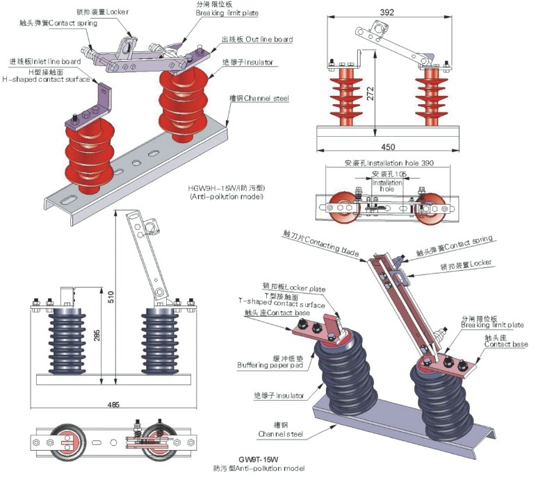 開關的額定電流有:200、 400、630和1000A。產(chǎn)品皆由底座,支柱絕緣子、導電部分和機構部分組成。采用閘刀式、結構分合閘達到切斷和閉合線路。每相閘刀由兩片導電刀片組成,刀片兩側外裝有壓縮彈簧,調節(jié)彈簧的高度可以得到開關閘刀所需要的接觸壓力。開關分合閘時用絕緣鉤棒操作機構部分便可以進行合閘運動。閘刀有自鎖裝置。